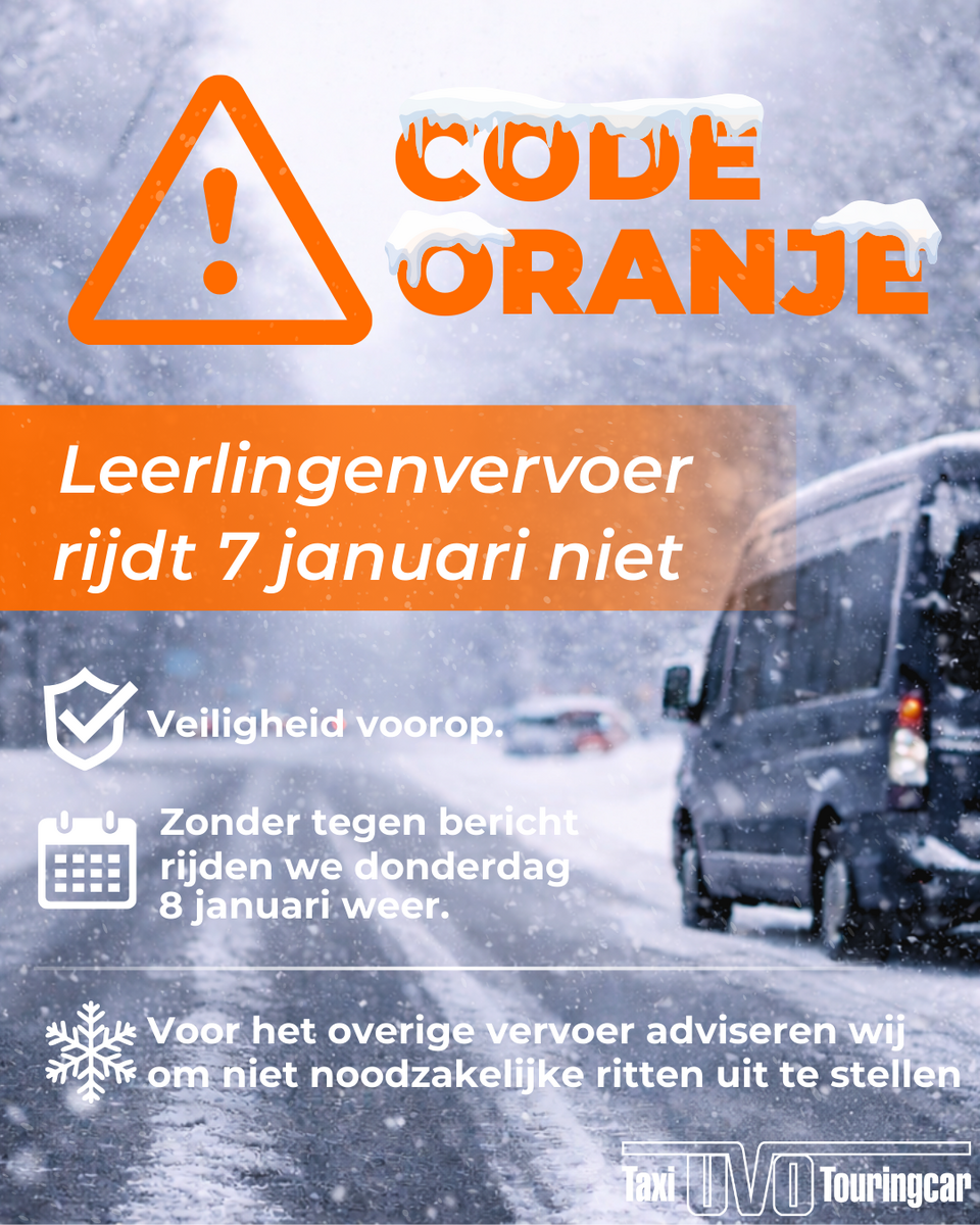 Het leerlingenvervoer rijdt op woensdag 7 januari niet. Voor het overige vervoer adviseren wij om niet noodzakelijke ritten uit te stellen.
